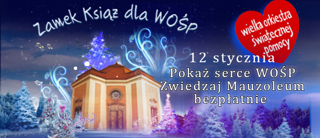 12 stycznia 2020 r. okażcie serce i pokażcie słynne serduszko WOŚP przy wejściu do Mauzoleum, a będziecie mogli je zwiedzać bezpłatnie. Wolontariusze akcji będą czekać na Was w Książu i w parku od godz. 10:00. To doskonała okazja, by włączyć się w tę niezwykle ważną inicjatywę i zobaczyć wyremontowane wnętrza krypty Hochbergów.
